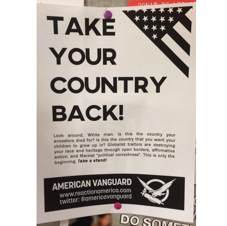 The posters advertised the so-called far-right group American Vanguard, which explicitly calls for the reclamation of a white America on their website. Its logo, pictured on the posters, depicts a bird carrying a fasces, or a bundle of rods tied around an axe, from which the term “fascist” is derived.